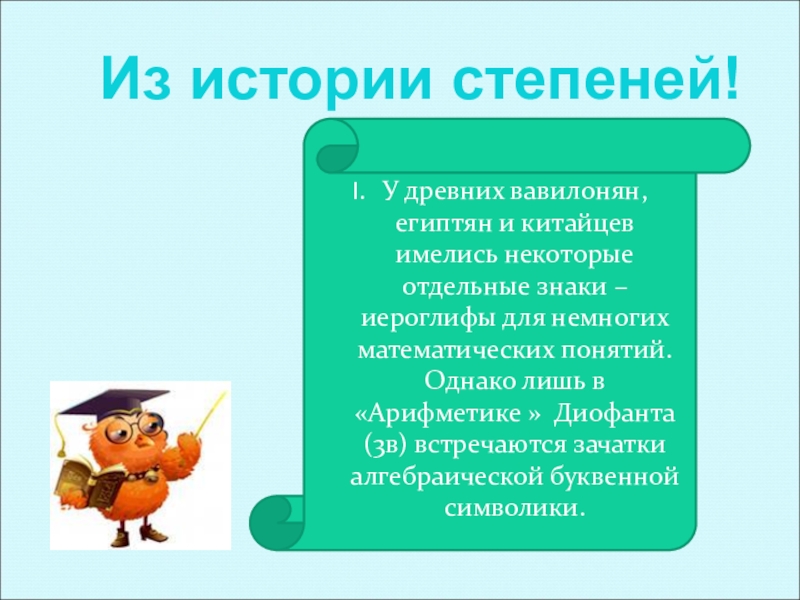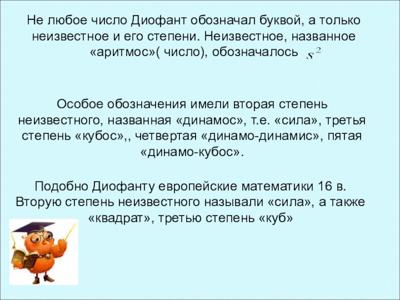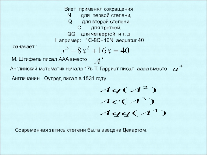 Подобно Диофанту европейские математики 16 в. Вторую степень неизвестного называли «сила», а также «квадрат», третью степень «куб»