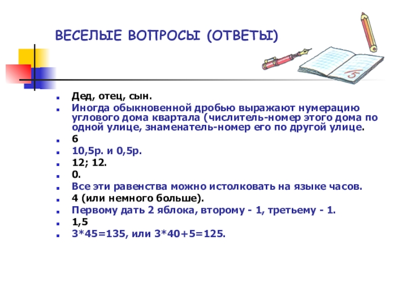 ВЕСЕЛЫЕ ВОПРОСЫ (ОТВЕТЫ) Дед, отец, сын. Иногда обыкновенной дробью выражают нумерацию углового дома квартала (числитель-номер этого дома по