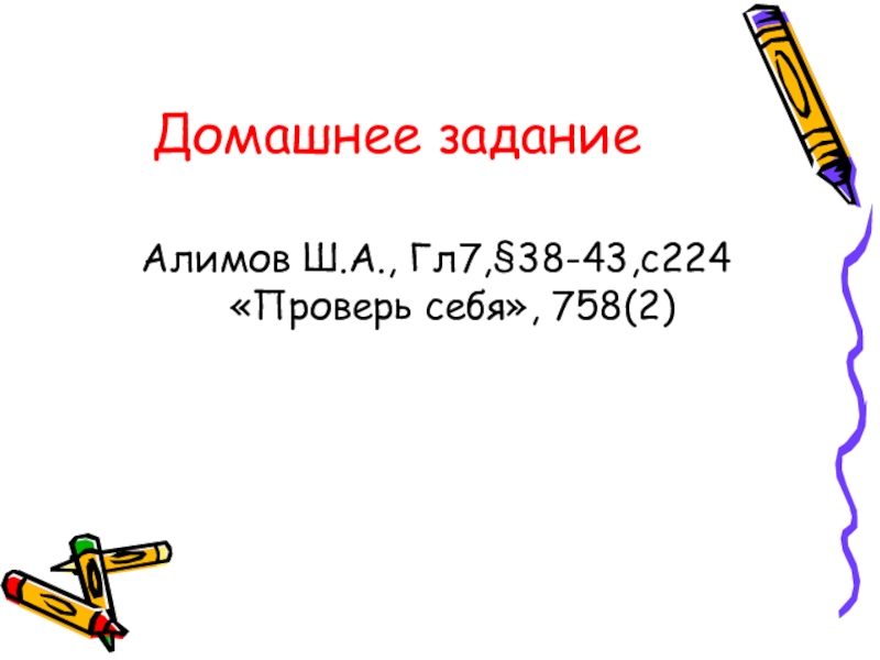 Домашнее заданиеАлимов Ш.А., Гл7,§38-43,с224 «Проверь себя», 758(2)