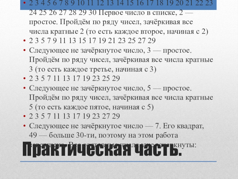 Практическая часть.Запишем натуральные числа начиная от 2 до 30 в ряд:2 3 4 5 6 7 8