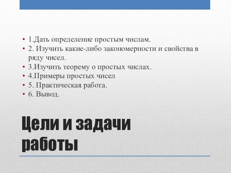 Цели и задачи работы1.Дать определение простым числам.2. Изучить какие-либо закономерности и свойства в ряду чисел.3.Изучить теорему о простых числах.4.Примеры простых чисел5. Практическая работа.6. Вывод.