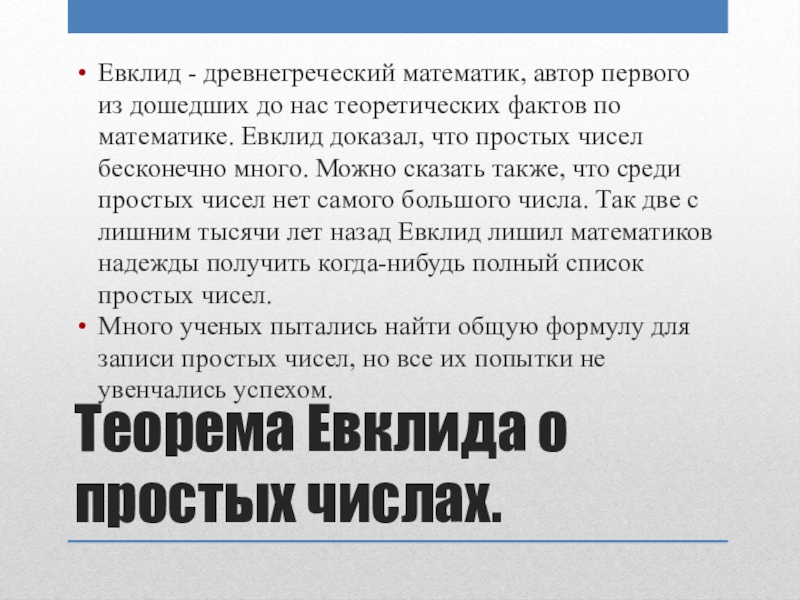 Теорема Евклида о простых числах.Евклид - древнегреческий математик, автор первого из дошедших до нас теоретических фактов по