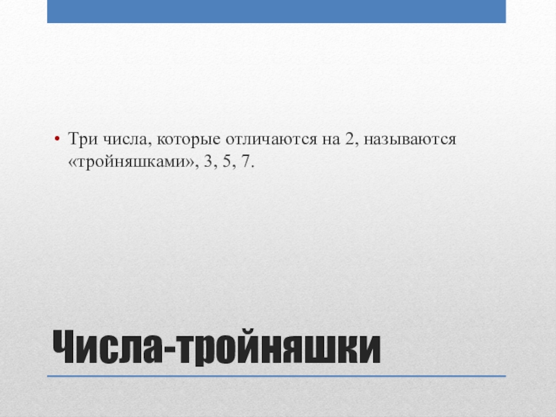 Числа-тройняшкиТри числа, которые отличаются на 2, называются «тройняшками», 3, 5, 7.