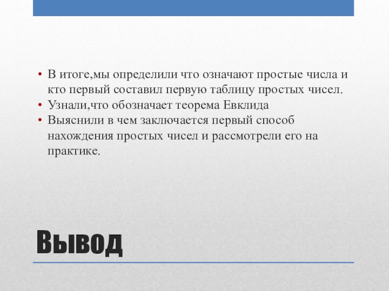 ВыводВ итоге,мы определили что означают простые числа и кто первый составил первую таблицу простых чисел.Узнали,что обозначает теорема