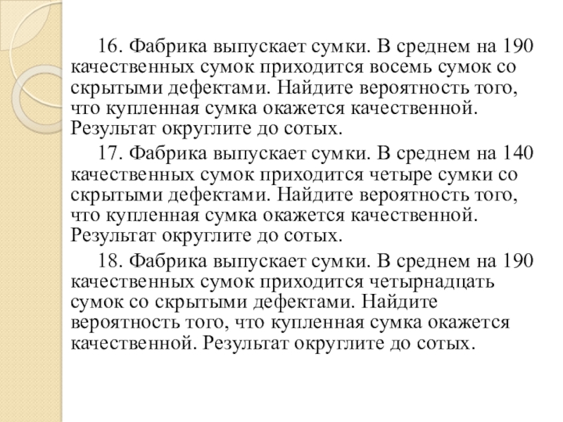 Слайд 34 16. Фабрика выпускает сумки. В среднем на 190