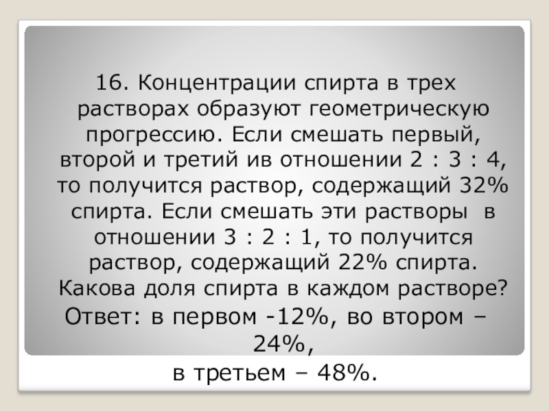 16. Концентрации спирта в трех растворах образуют геометрическую прогрессию. Если смешать