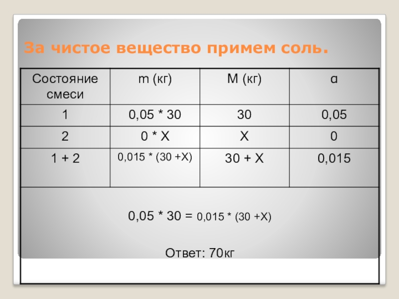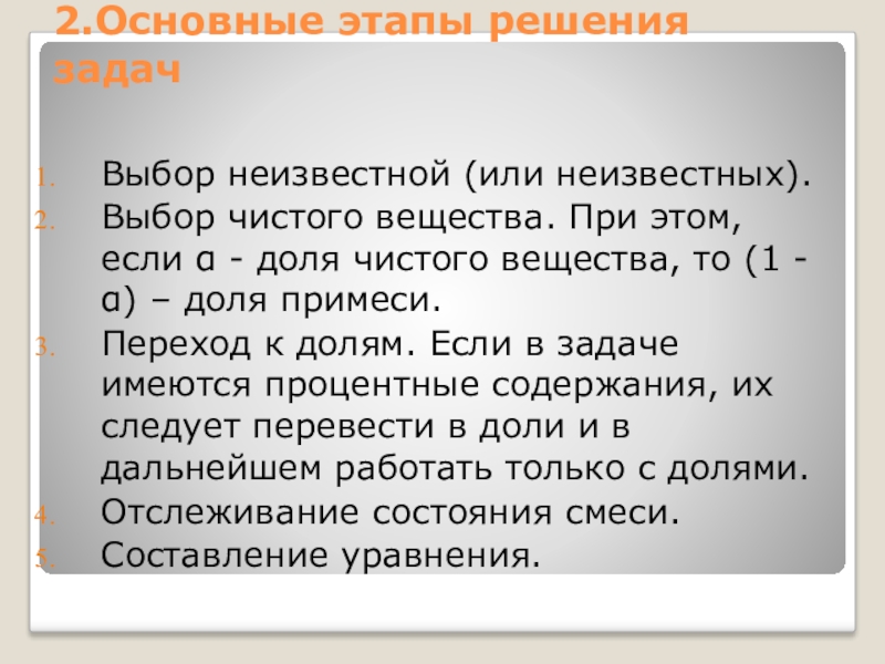 Переход к долям. Если в задаче имеются процентные содержания, их следует перевести в доли и в дальнейшем работать только с долями.