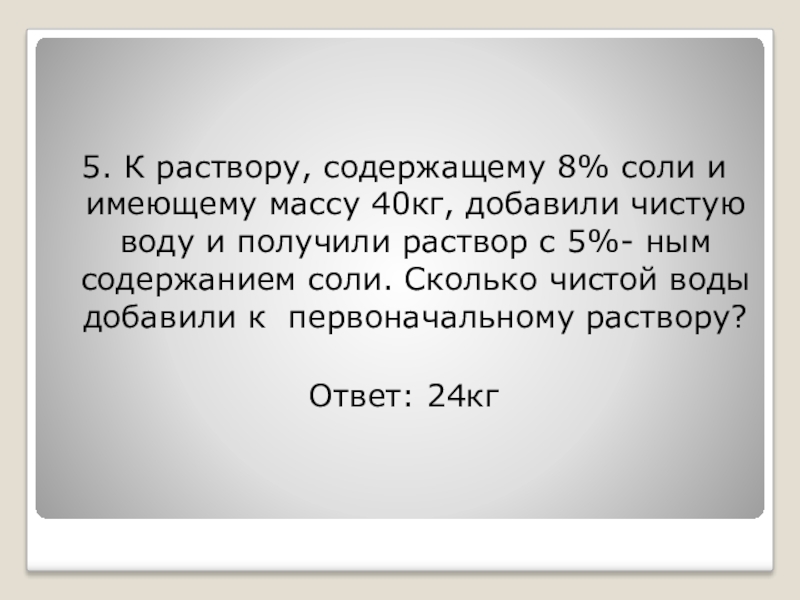 5. К раствору, содержащему 8% соли и имеющему массу 40кг, добавили