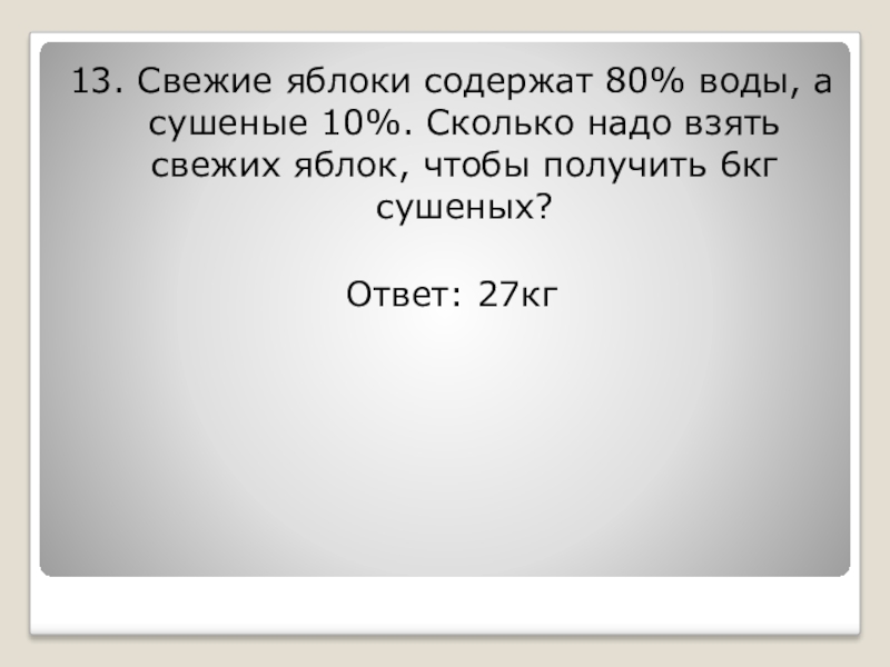 13. Свежие яблоки содержат 80% воды, а сушеные 10%. Сколько надо