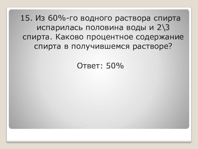 15. Из 60%-го водного раствора спирта испарилась половина воды и 2\3