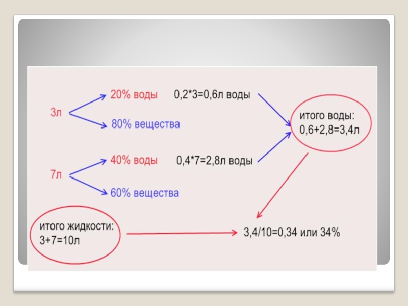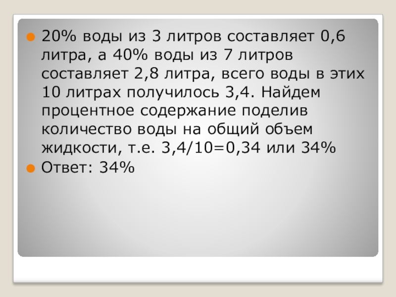 из 7 литров составляет 2,8 литра, всего воды в этих 10 литрах получилось 3,4. Найдем процентное содержание поделив количество воды на общий объем жидкости, т.е. 3,4/10=0,34 или 34%