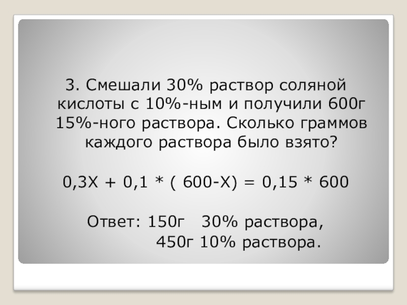 3. Смешали 30% раствор соляной кислоты с 10%-ным и получили 600г