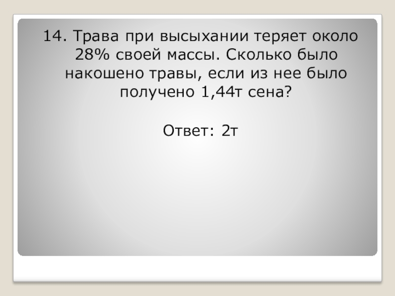 14. Трава при высыхании теряет около 28% своей массы. Сколько было