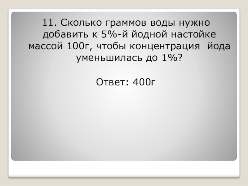 11. Сколько граммов воды нужно добавить к 5%-й йодной настойке массой