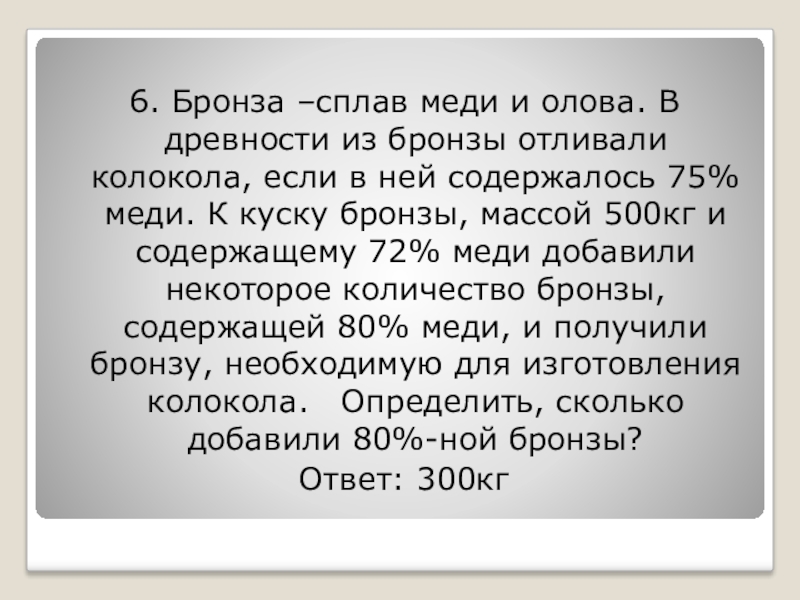 колокола, если в ней содержалось 75% меди. К куску бронзы, массой 500кг и содержащему 72% меди добавили некоторое количество бронзы, содержащей 80% меди, и получили бронзу, необходимую для изготовления колокола. Определить, сколько добавили 80%-ной бронзы?