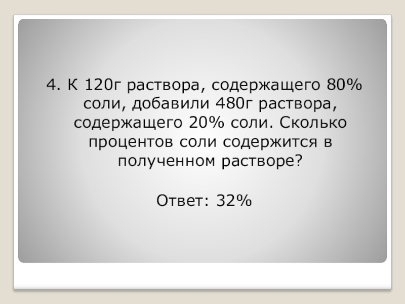 4. К 120г раствора, содержащего 80% соли, добавили 480г раствора, содержащего