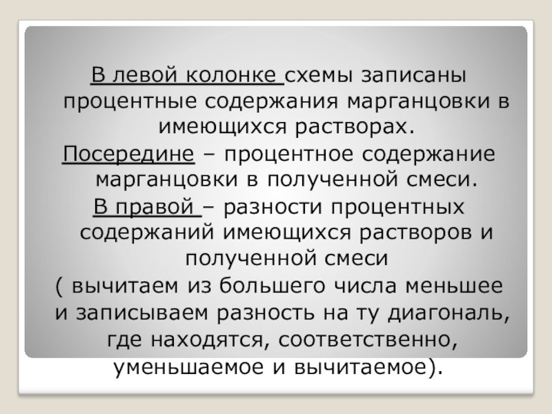 В левой колонке схемы записаны процентные содержания марганцовки в имеющихся растворах.