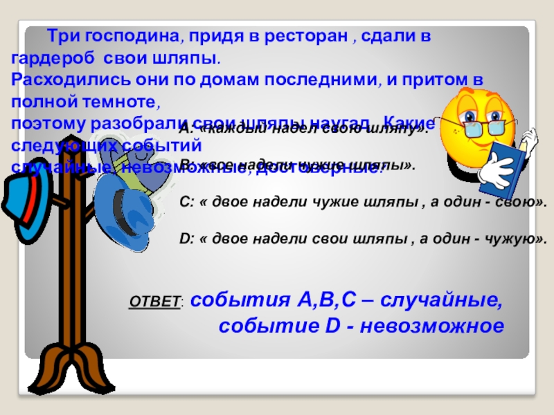 D: « двое надели свои шляпы , а один - чужую».