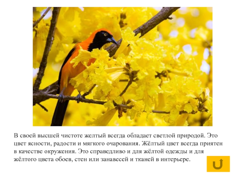 Слайд 40В своей высшей чистоте желтый всегда обладает светлой природой. Это цвет