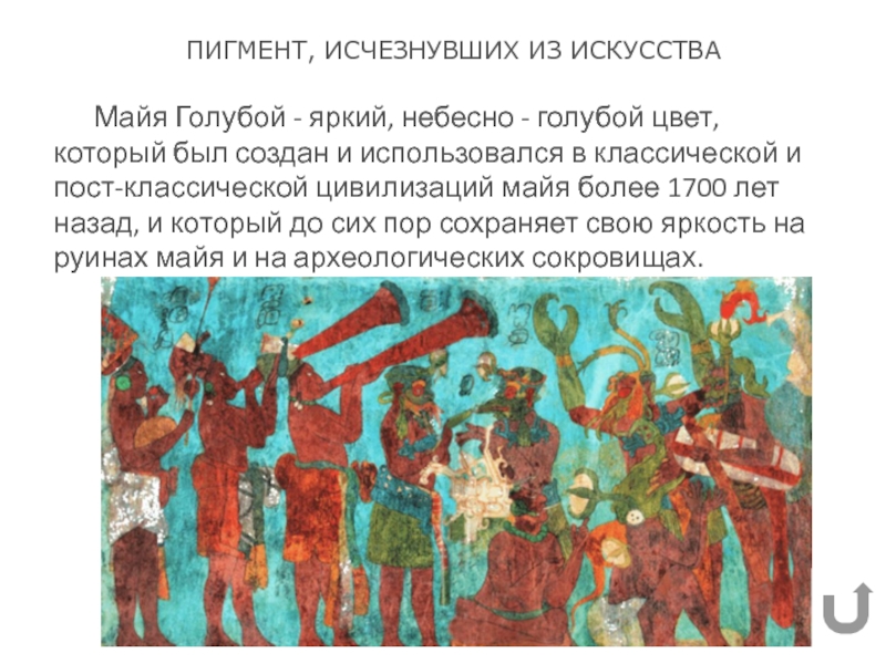 голубой цвет, который был создан и использовался в классической и пост-классической цивилизаций майя более 1700 лет назад, и который до сих пор сохраняет свою яркость на руинах майя и на археологических сокровищах.