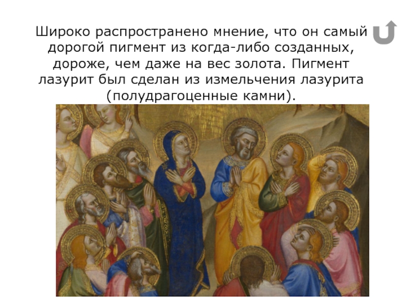 дороже, чем даже на вес золота. Пигмент лазурит был сделан из измельчения лазурита (полудрагоценные камни).