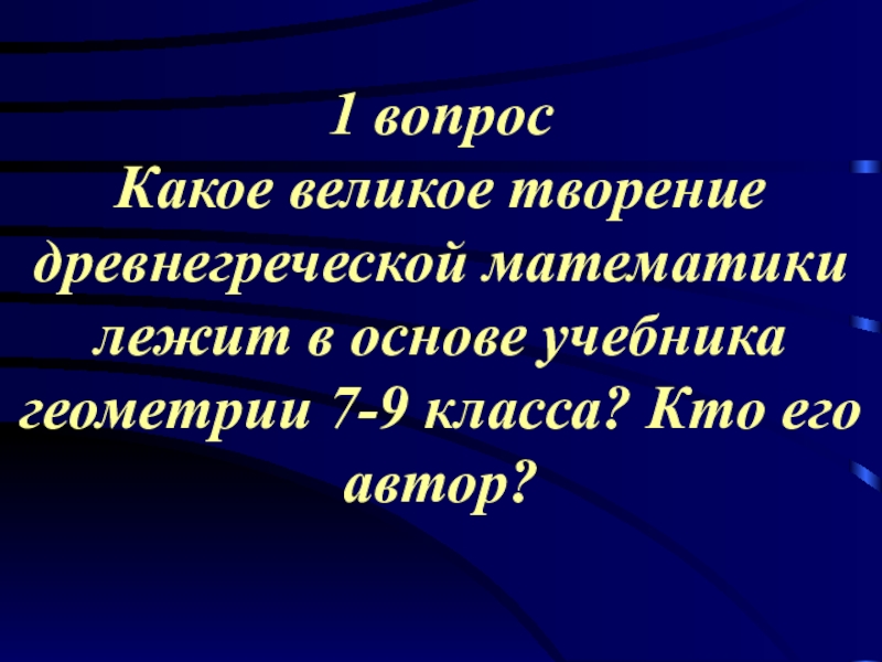 1 вопрос Какое великое творение древнегреческой математики лежит в основе учебника геометрии 7-9 класса? Кто его автор?