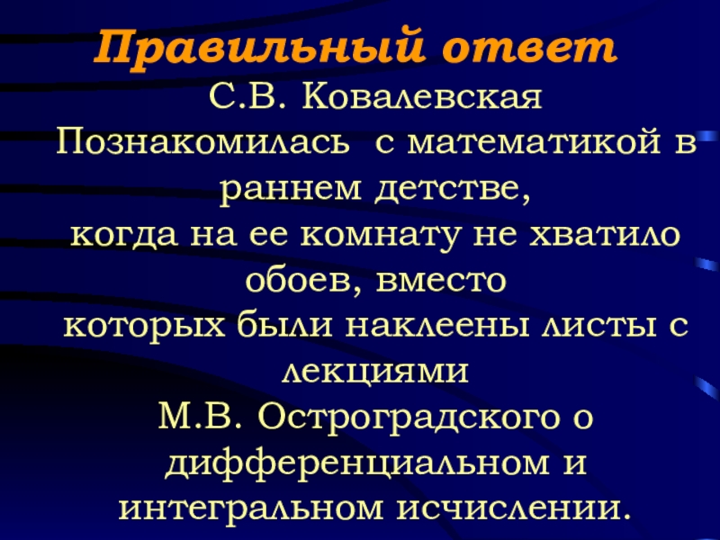 Правильный ответС.В. КовалевскаяПознакомилась с математикой в раннем детстве,когда на ее комнату не хватило обоев, вместо которых были