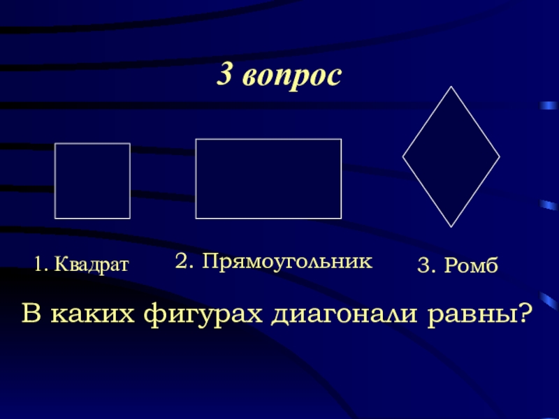3 вопрос1. Квадрат2. Прямоугольник3. РомбВ каких фигурах диагонали равны?