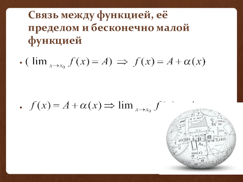 Слайд 10Связь между функцией, её пределом и бесконечно малой функцией