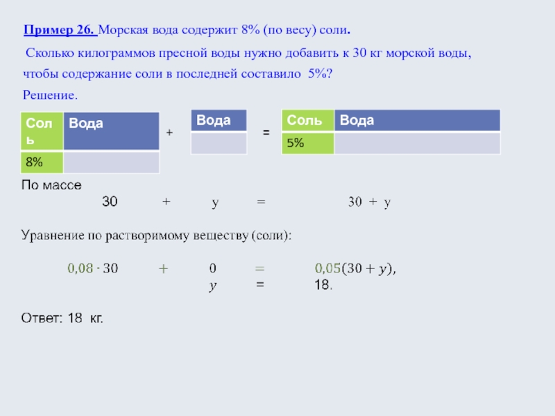 Слайд 22Пример 26. Морская вода содержит 8% (по весу) соли.