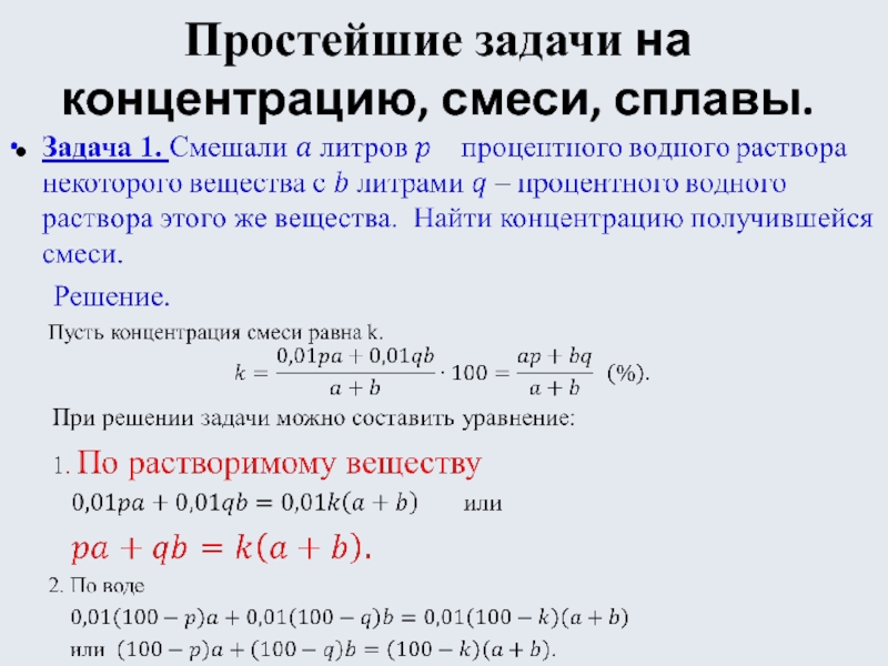 Слайд 18Простейшие задачи на концентрацию, смеси, сплавы.
