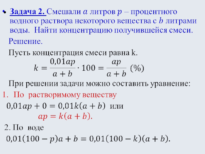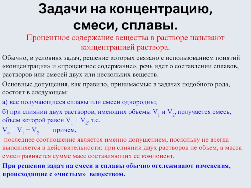 Обычно, в условиях задач, решение которых связано с использованием понятий «концентрация» и «процентное содержание», речь идет о составлении сплавов, растворов или смесей двух или нескольких веществ.