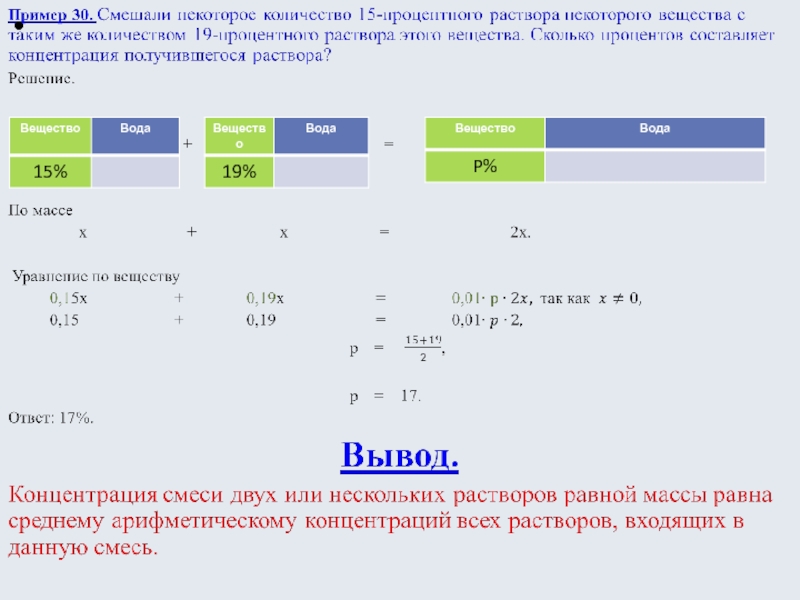 Пример 42. Смешали некоторое количество 16-процентного раствора некоторого вещества с таким же количеством 18-процентного раствора этого вещества. Сколько процентов составляет концентрация получившегося раствора?