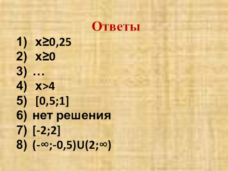 х≥0,25 х≥0… х>4 [0,5;1]нет решения[-2;2](-∞;-0,5)U(2;∞)Ответы