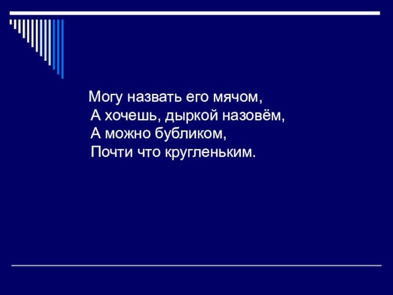 Могу назвать его мячом, А хочешь, дыркой назовём, А можно бубликом, Почти что кругленьким.