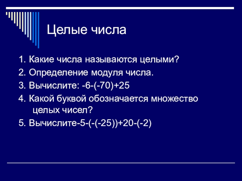 Целые числа1. Какие числа называются целыми?2. Определение модуля числа.3. Вычислите: -6-(-70)+254. Какой буквой обозначается множество целых чисел?5.