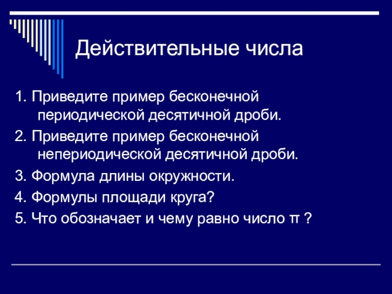 Действительные числа1. Приведите пример бесконечной периодической десятичной дроби.2. Приведите пример бесконечной непериодической десятичной дроби.3. Формула длины окружности.4.