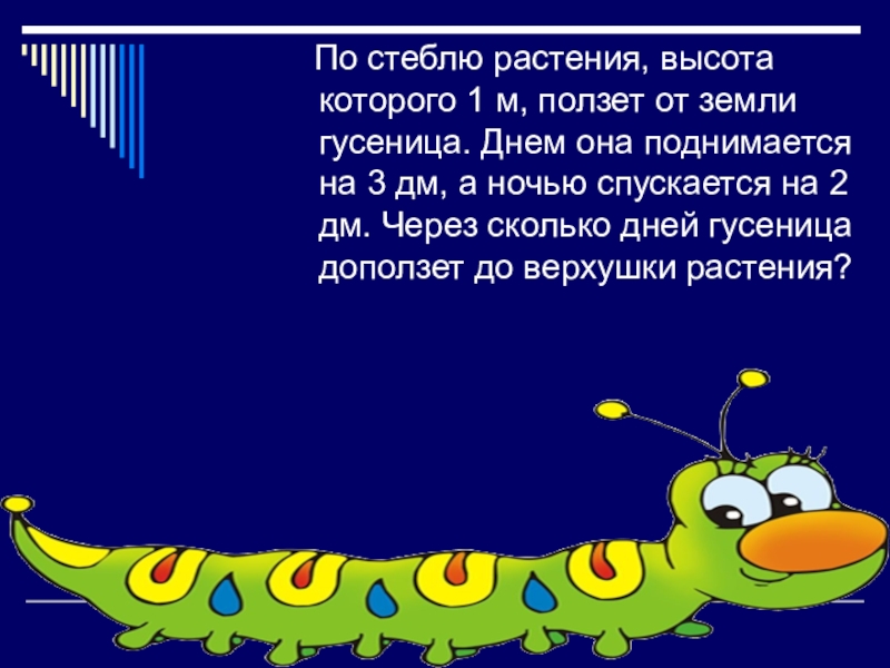 земли гусеница. Днем она поднимается на 3 дм, а ночью спускается на 2 дм. Через сколько дней гусеница доползет до верхушки растения?