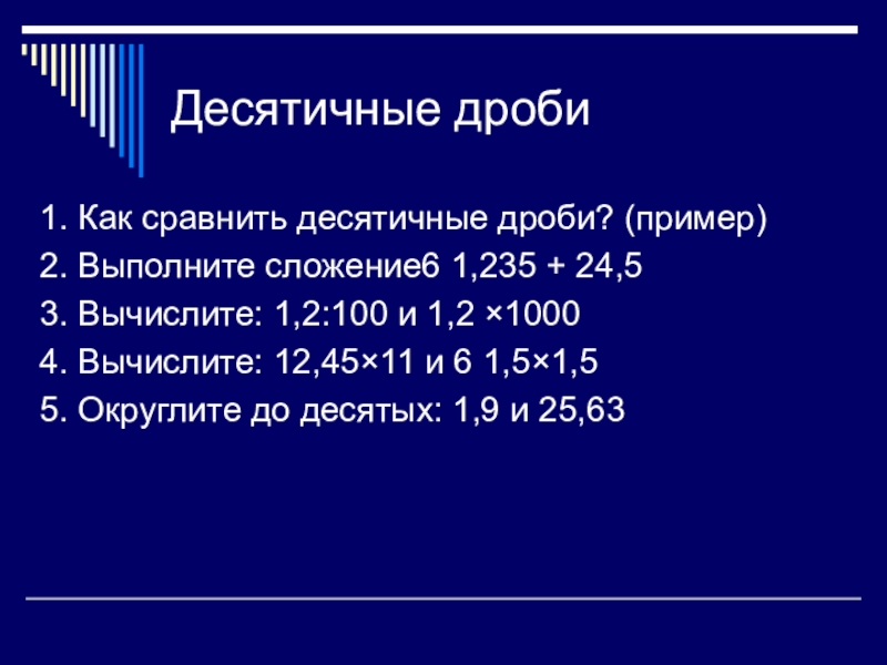 Десятичные дроби1. Как сравнить десятичные дроби? (пример)2. Выполните сложение6 1,235 + 24,53. Вычислите: 1,2:100 и 1,2 ×10004.