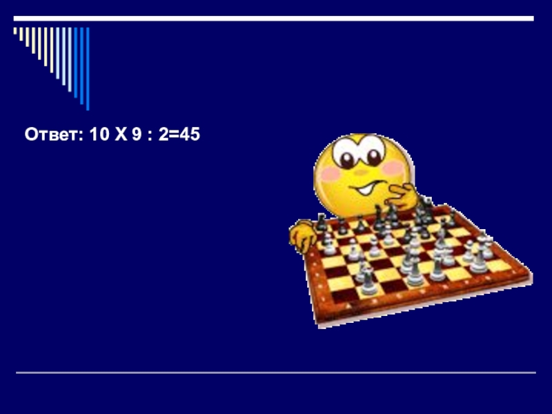 Слайд 13Ответ: 10 Х 9 : 2=45
