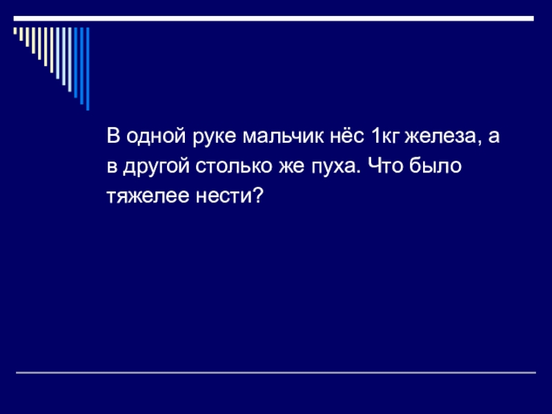 Слайд 20В одной руке мальчик нёс 1кг железа, а