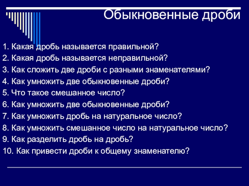 Обыкновенные дроби 1. Какая дробь называется правильной?2. Какая дробь называется неправильной?3. Как сложить две дроби с разными
