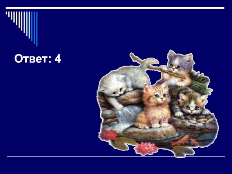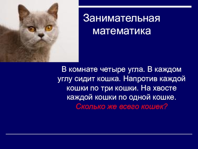 Занимательная математикаВ комнате четыре угла. В каждом углу сидит кошка. Напротив каждой кошки по три кошки. На