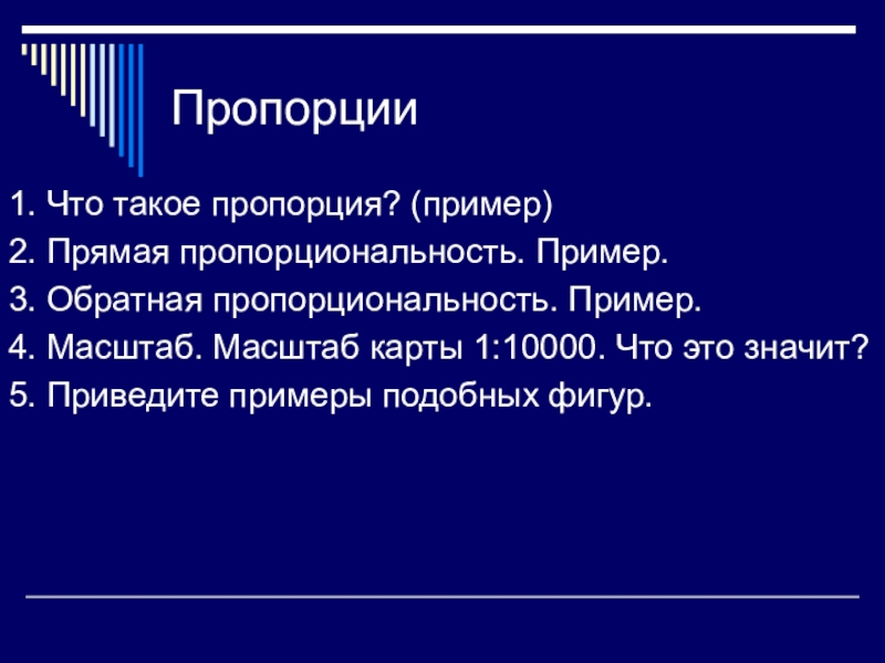 Пропорции1. Что такое пропорция? (пример)2. Прямая пропорциональность. Пример.3. Обратная пропорциональность. Пример.4. Масштаб. Масштаб карты 1:10000. Что это