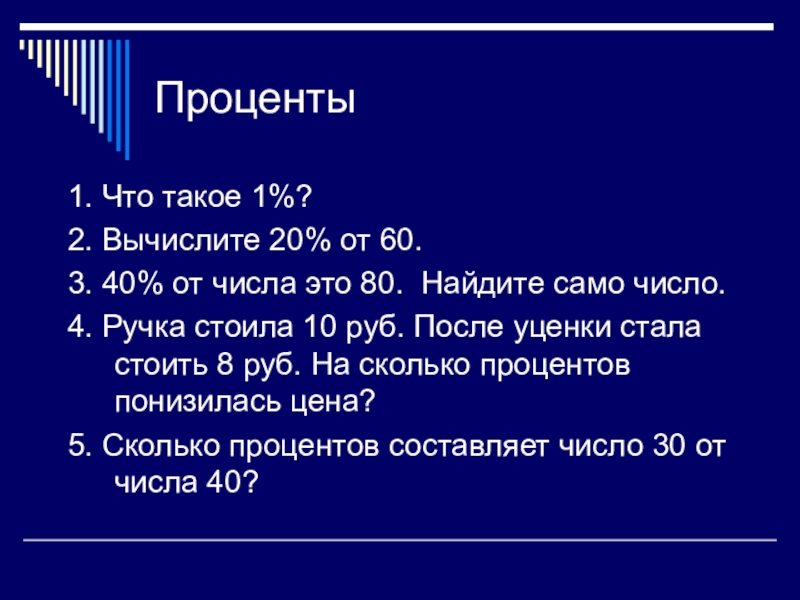 Проценты1. Что такое 1%?2. Вычислите 20% от 60.3. 40% от числа это 80. Найдите само число.4. Ручка
