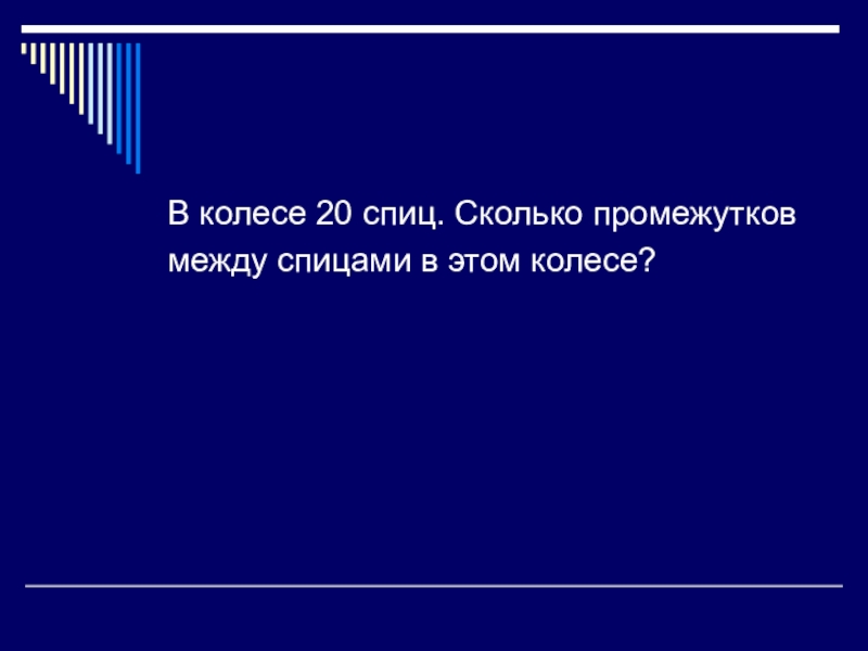 Слайд 28В колесе 20 спиц. Сколько промежутков