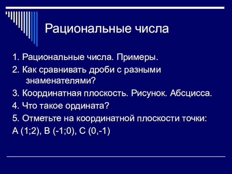 Рациональные числа1. Рациональные числа. Примеры.2. Как сравнивать дроби с разными знаменателями?3. Координатная плоскость. Рисунок. Абсцисса.4. Что такое