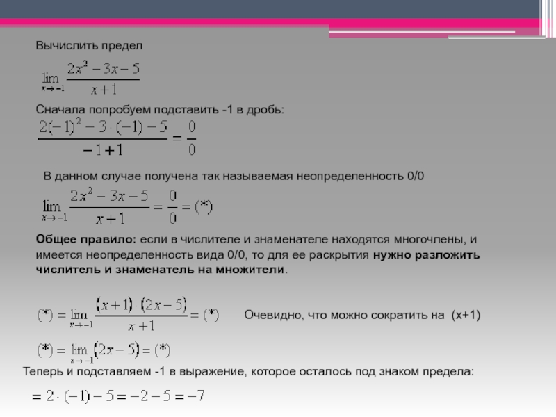 Общее правило: если в числителе и знаменателе находятся многочлены, и имеется неопределенность вида 0/0, то для ее раскрытия нужно разложить числитель и знаменатель на множители.