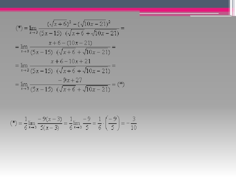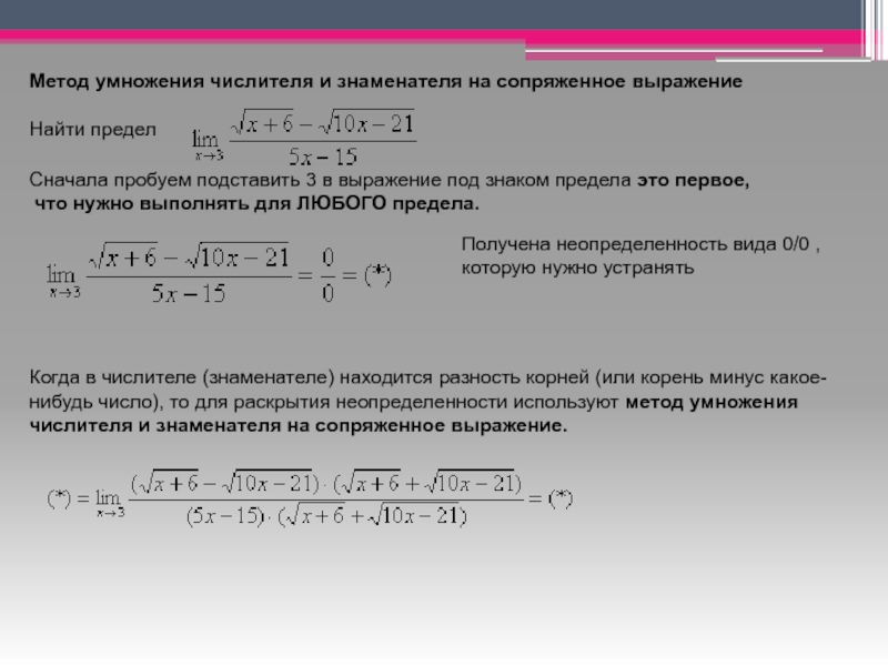Когда в числителе (знаменателе) находится разность корней (или корень минус какое-нибудь число), то для раскрытия неопределенности используют метод умножения числителя и знаменателя на сопряженное выражение.