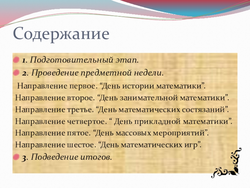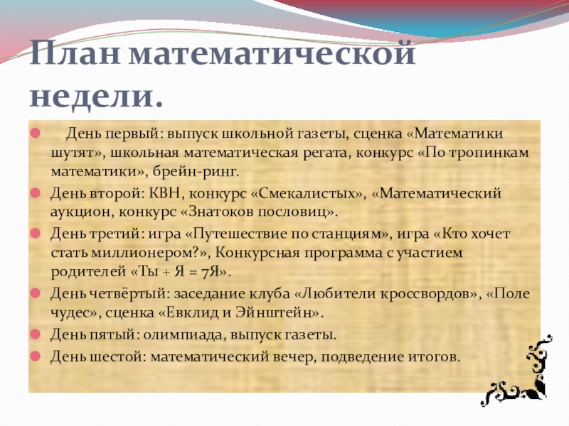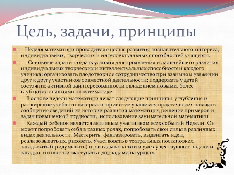 В основе недели математики лежат следующие принципы: углубление и расширение учебного материала, привитие учащимся практических навыков, сообщение сведений из истории развития математики, решение примеров и задач повышенной трудности, использование занимательной математики.